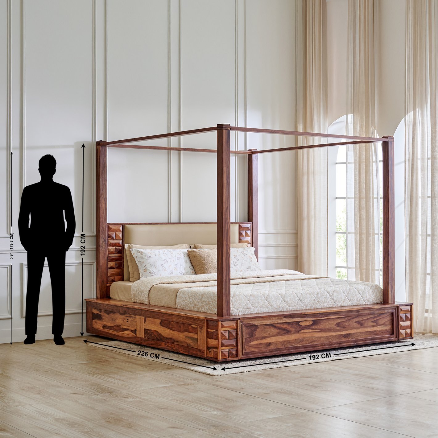 (Note: The man standing next to the bed is shown as 5'9" (175.26 cm) for scale reference against the post height.)
