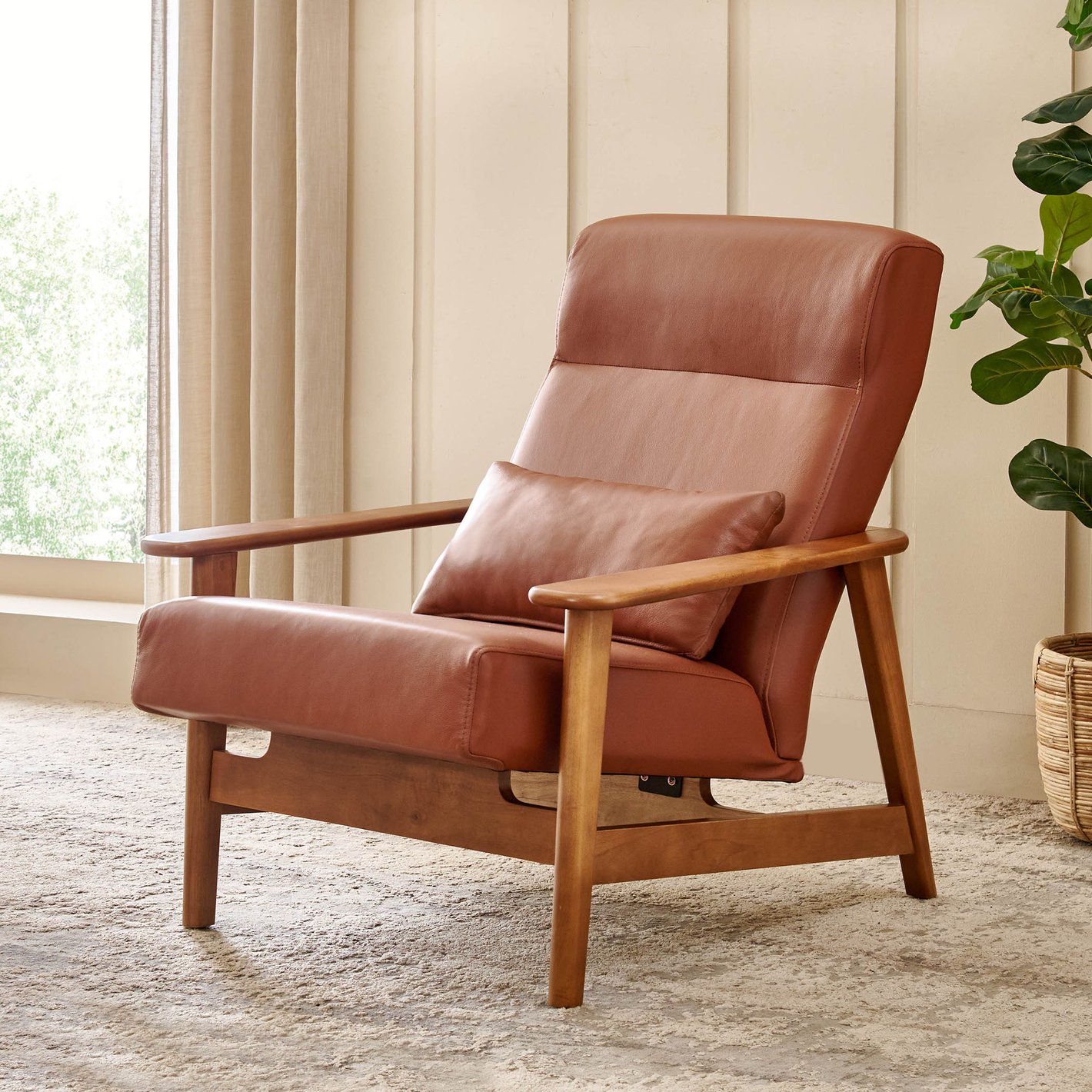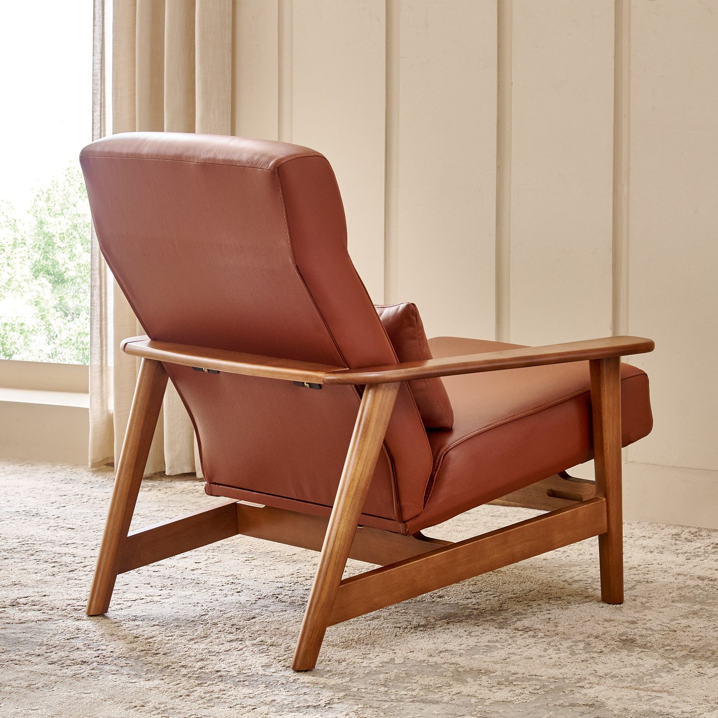 This chair is a sophisticated nod to classic mid-century Scandinavian design. It pairs a warm, exposed wooden frame with rich, reddish-brown leather upholstery. Unlike the previous accent chairs, this is a true lounge chair—designed with a deeper seat and higher back for extended relaxation and full-body support.