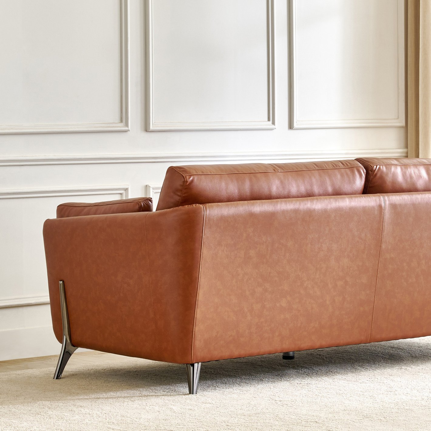 Rich Leather Upholstery: The sofa is covered in a beautiful, warm cognac or caramel-toned leather (or high-quality faux leather). This material offers durability and a luxurious visual texture.