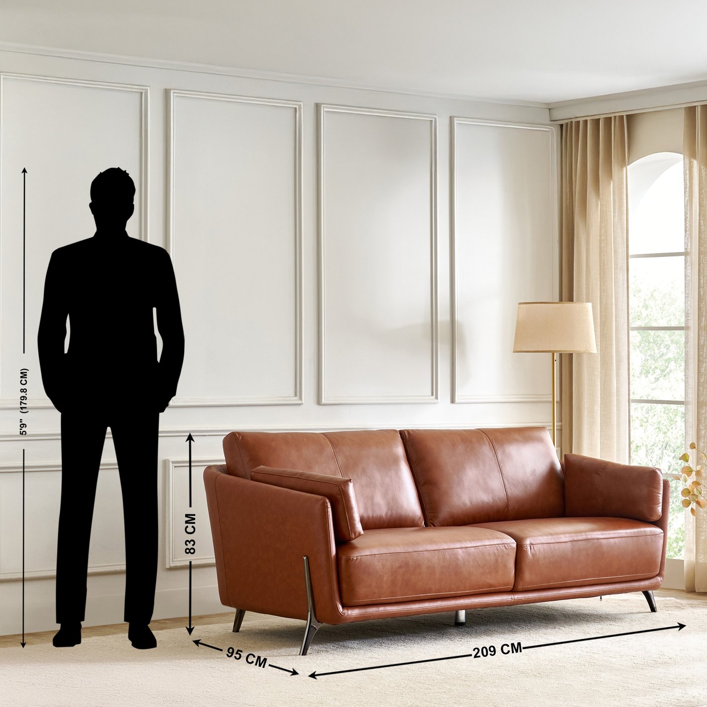 Scale Reference: Shown next to a $5'9''$ ($179.8\text{ cm}$) figure, demonstrating it is a standard-height sofa.