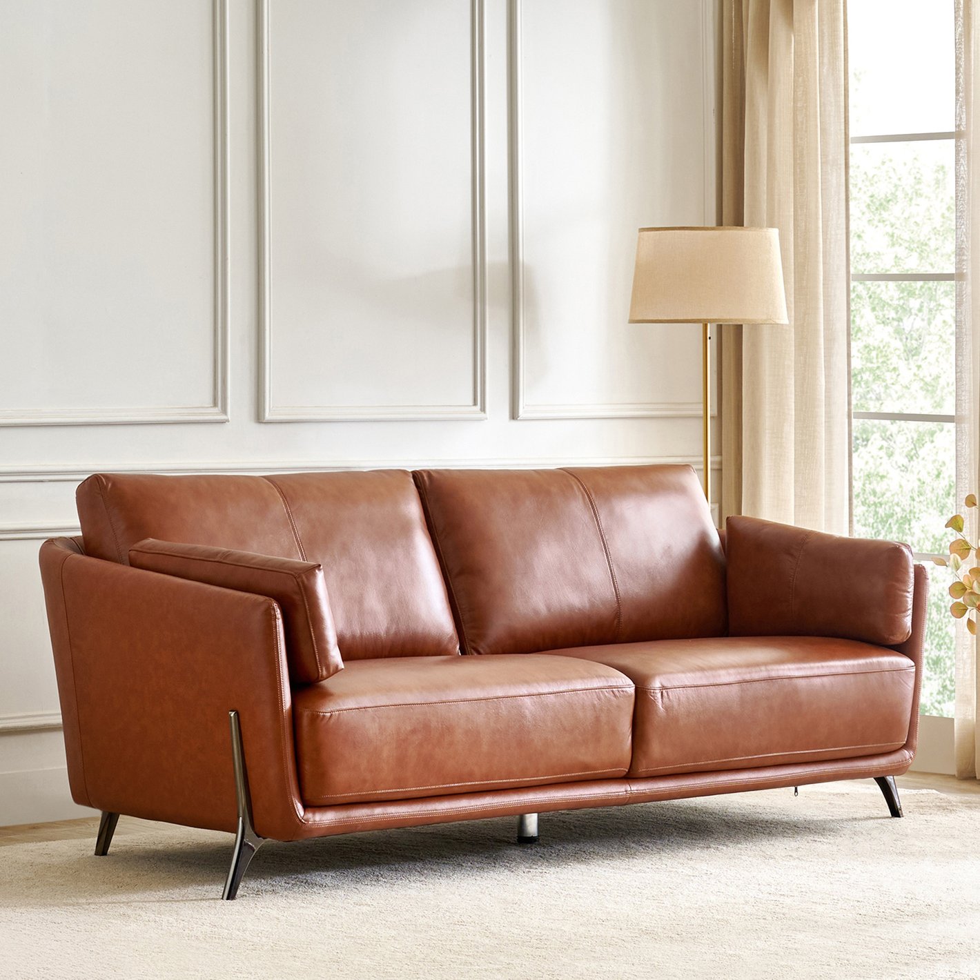 Modern Metal Base: The sofa is supported by slender, angled metal legs, which are set slightly back to create a subtle floating effect and contribute to its modern silhouette.