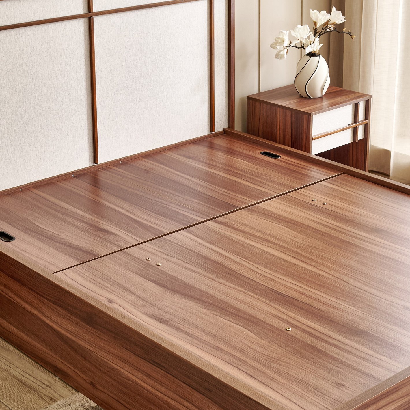 Design: Features a rich, deep walnut-finish or similar dark wood veneer on the platform base, providing a warm and sophisticated anchor to the room.