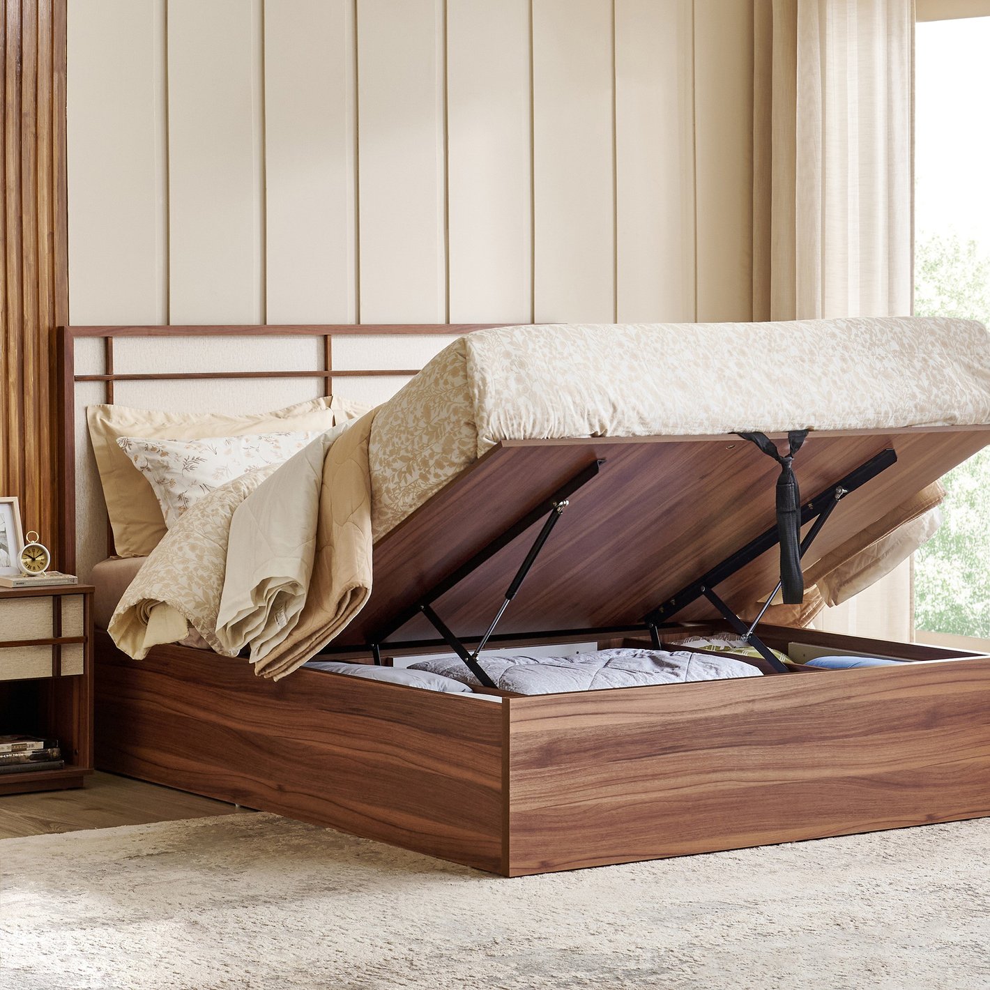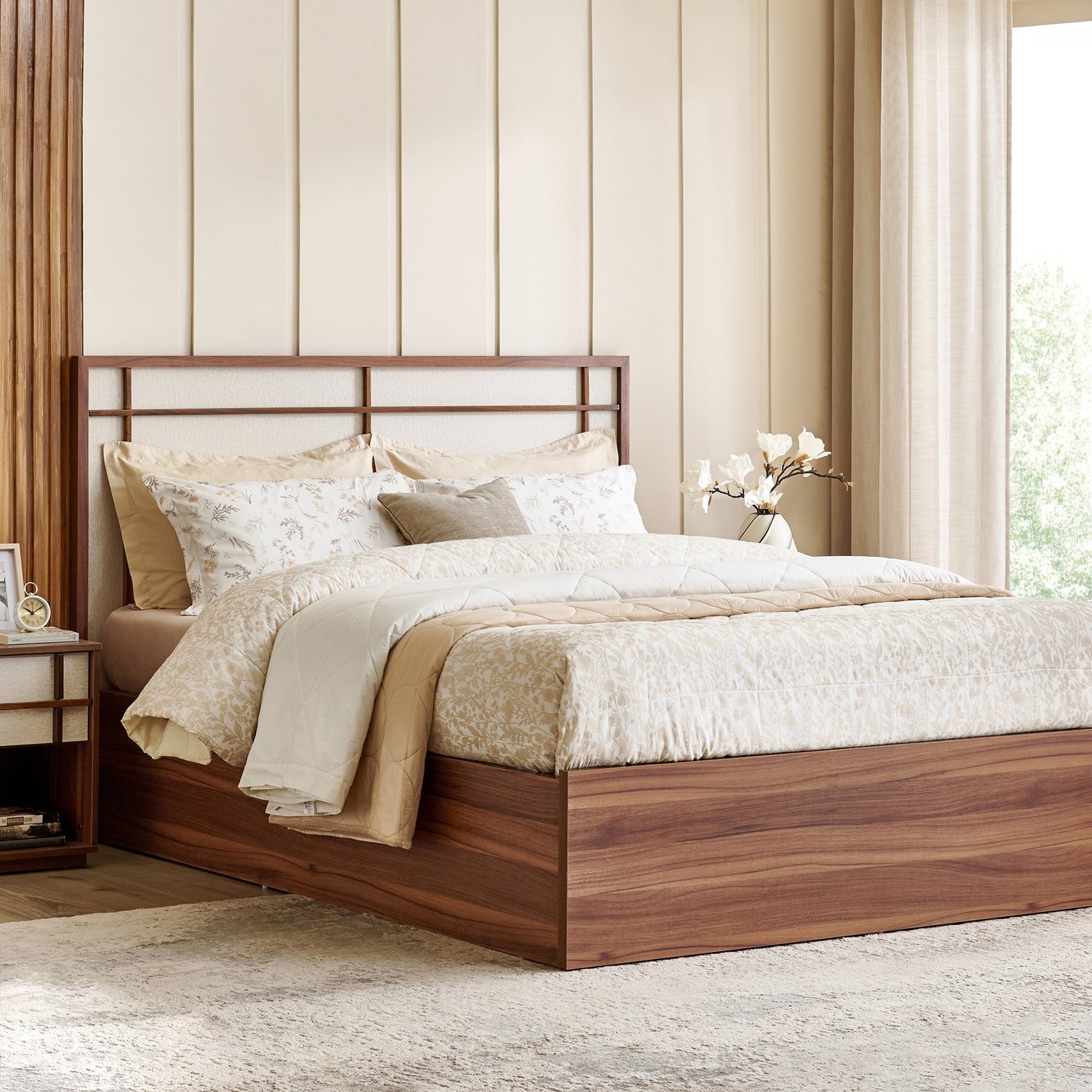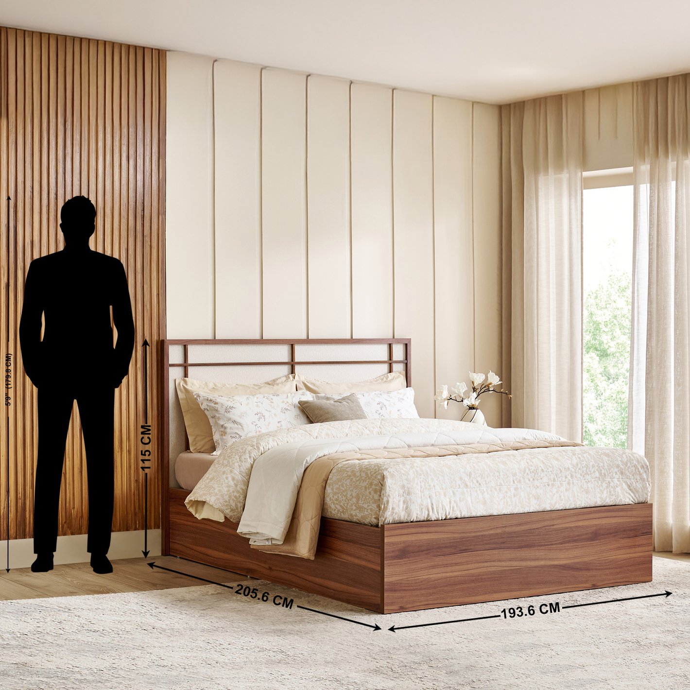Aesthetics: The bed is styled in a neutral, calming setting with light-toned bedding, a textured rug, and light, flowing curtains, suggesting a versatile piece that complements various decor schemes.