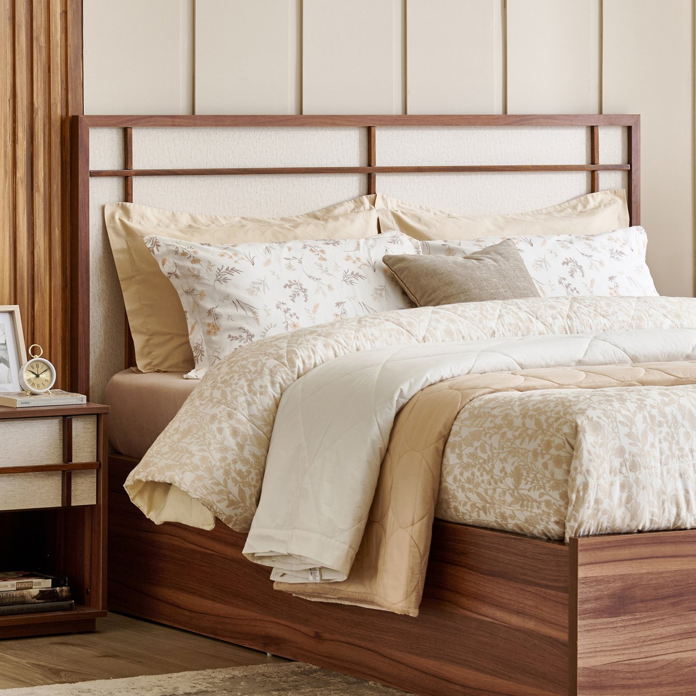 Headboard: A distinctive headboard with a minimalist, open geometric lattice or railing design in a contrasting dark wood finish sits atop a cushioned/upholstered panel that blends seamlessly with the light wall treatment.