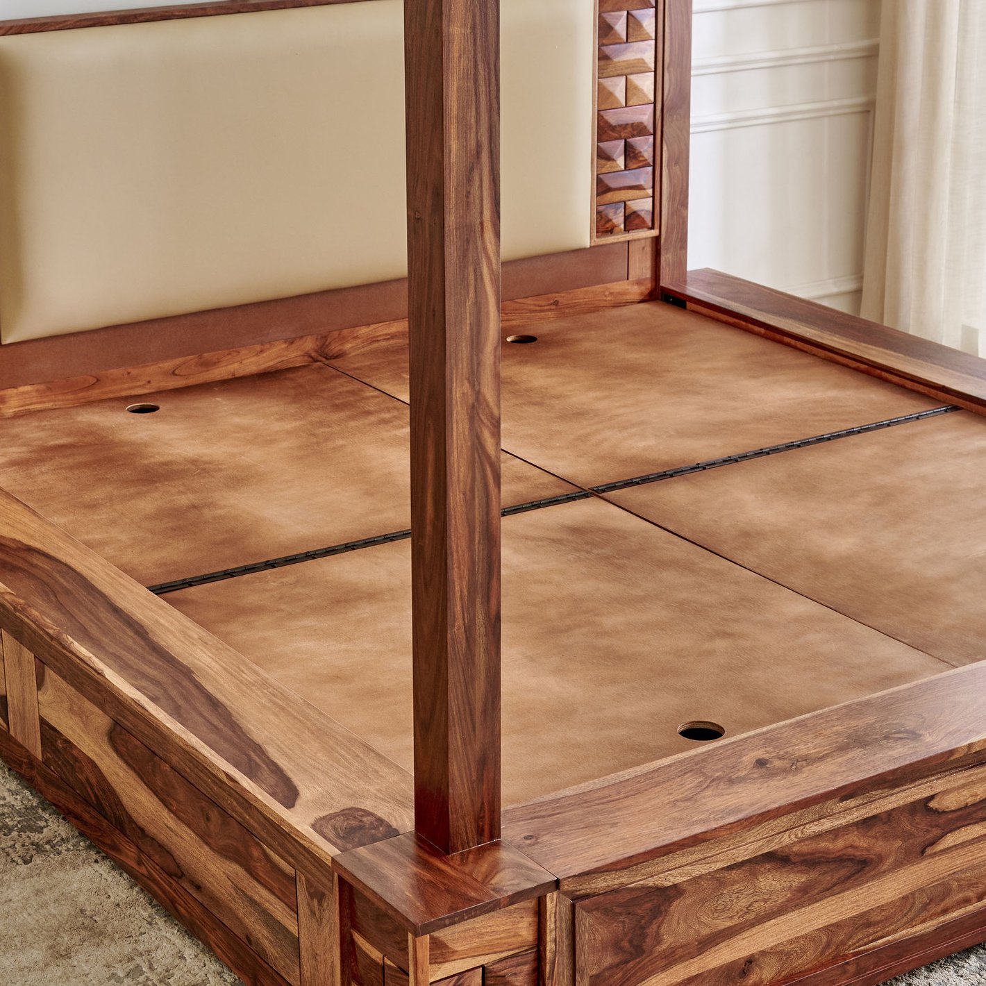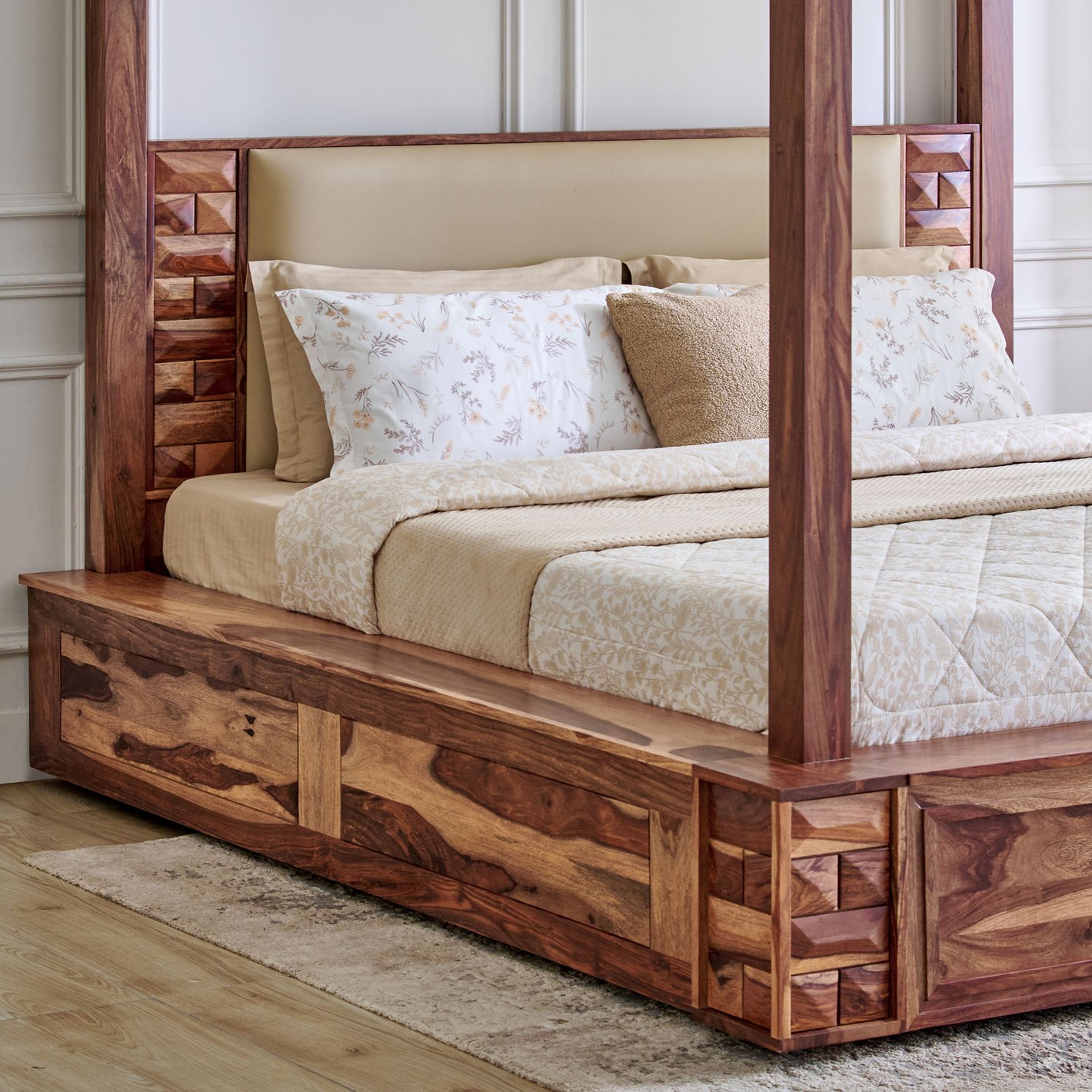 Footboard Detailing: The footboard also features the same decorative geometric block molding found on the headboard, ensuring a cohesive and premium look.