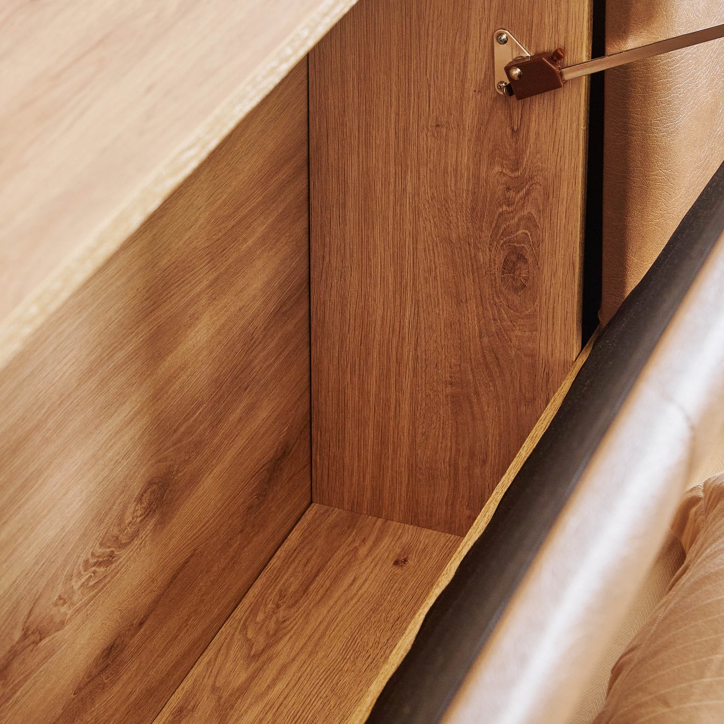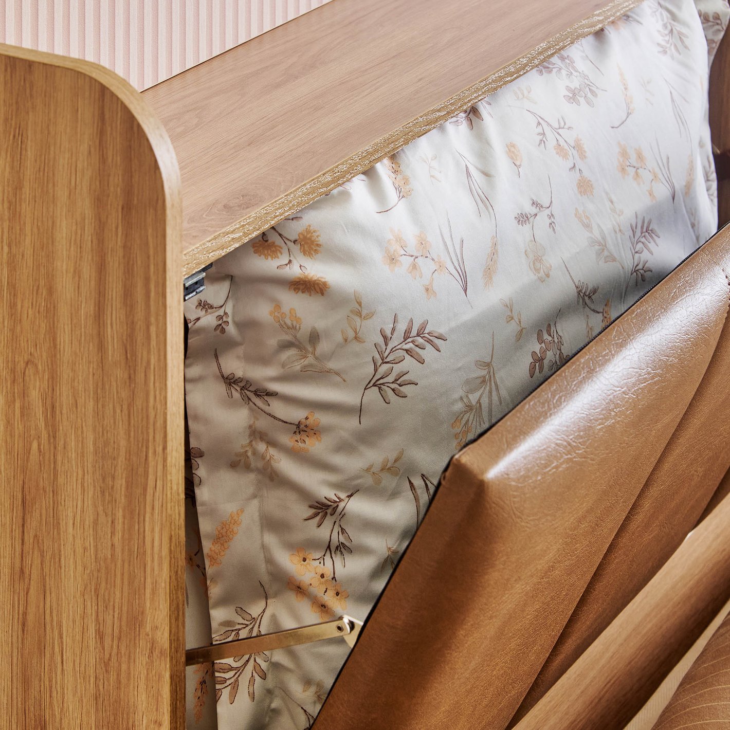 Hydraulic Storage Lift: The main feature is the full-size hydraulic lift mechanism under the mattress platform (as shown in the third image), providing extensive and easy-access storage space beneath the entire bed base. This is ideal for linens, seasonal clothing, and bulky items.