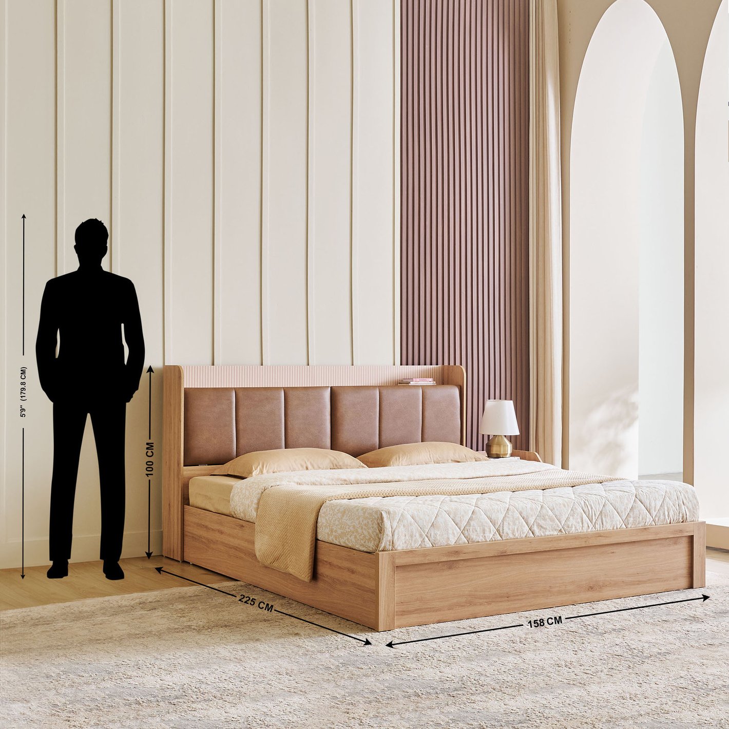 (Note: The man standing next to the bed is shown as 5'9" (179.8 cm) for scale reference against the headboard height.)
