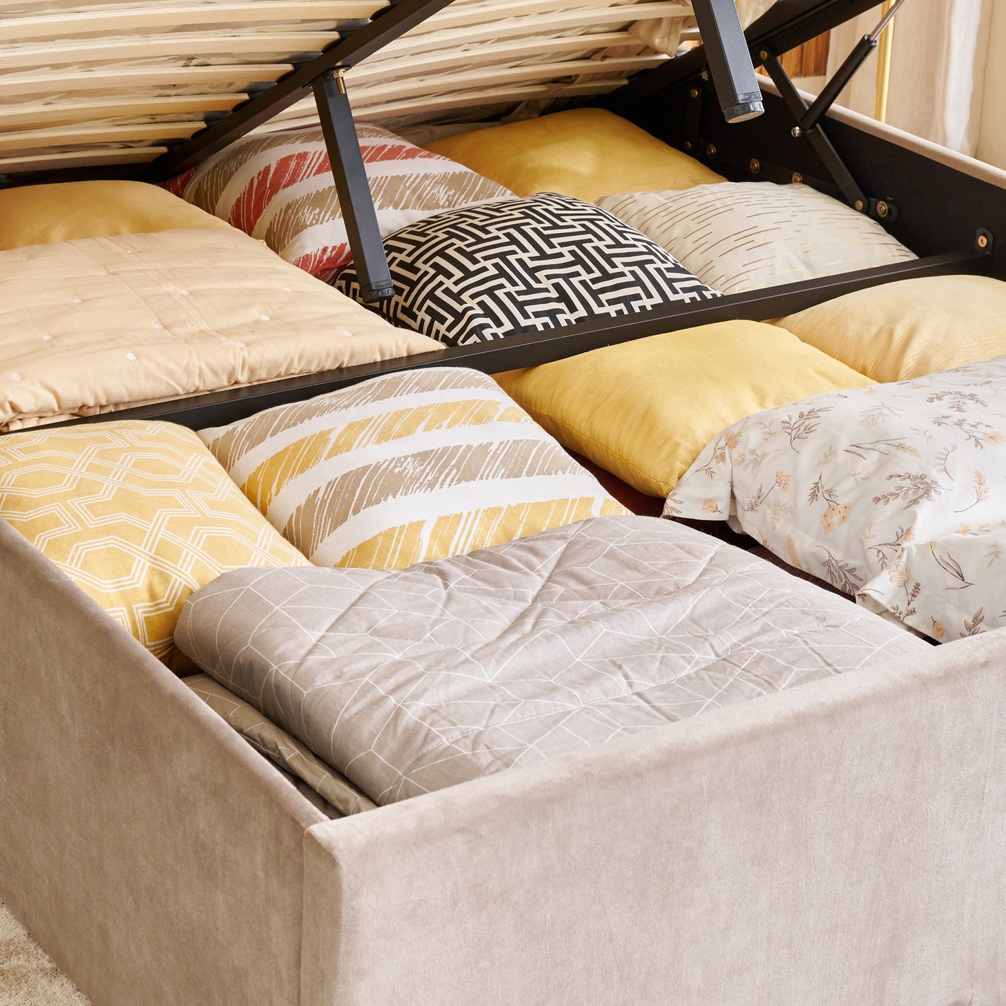 Mattress Support: The lifting mechanism reveals a sturdy metal frame with wooden slats to support the mattress, ensuring good air circulation and durability.