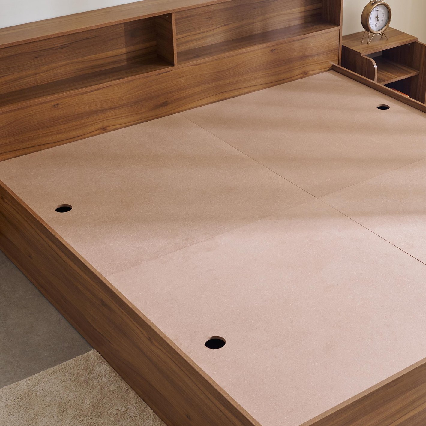Box Storage: The platform mattress base includes manual access box storage beneath the mattress (as seen in the internal view with the circular cutouts), providing extensive, discreet space for storing linens and off-season clothing.