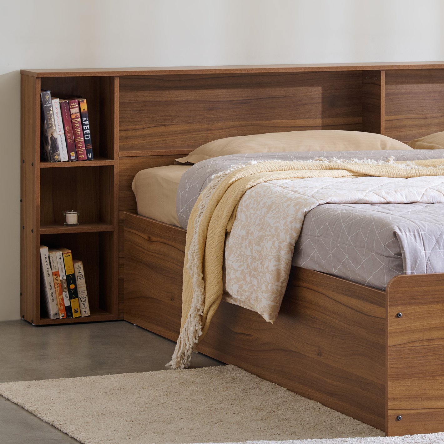 Integrated Bookcase Headboard: The headboard is designed as a functional storage unit: