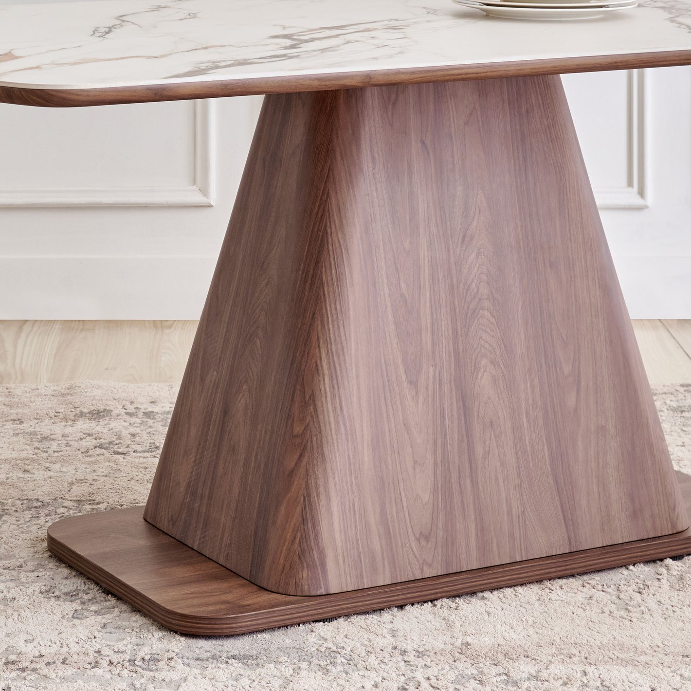 Visual Impact: This table makes a sophisticated statement. The combination of the sleek white top and the warm, geometric wood base is a hallmark of high-end contemporary design.