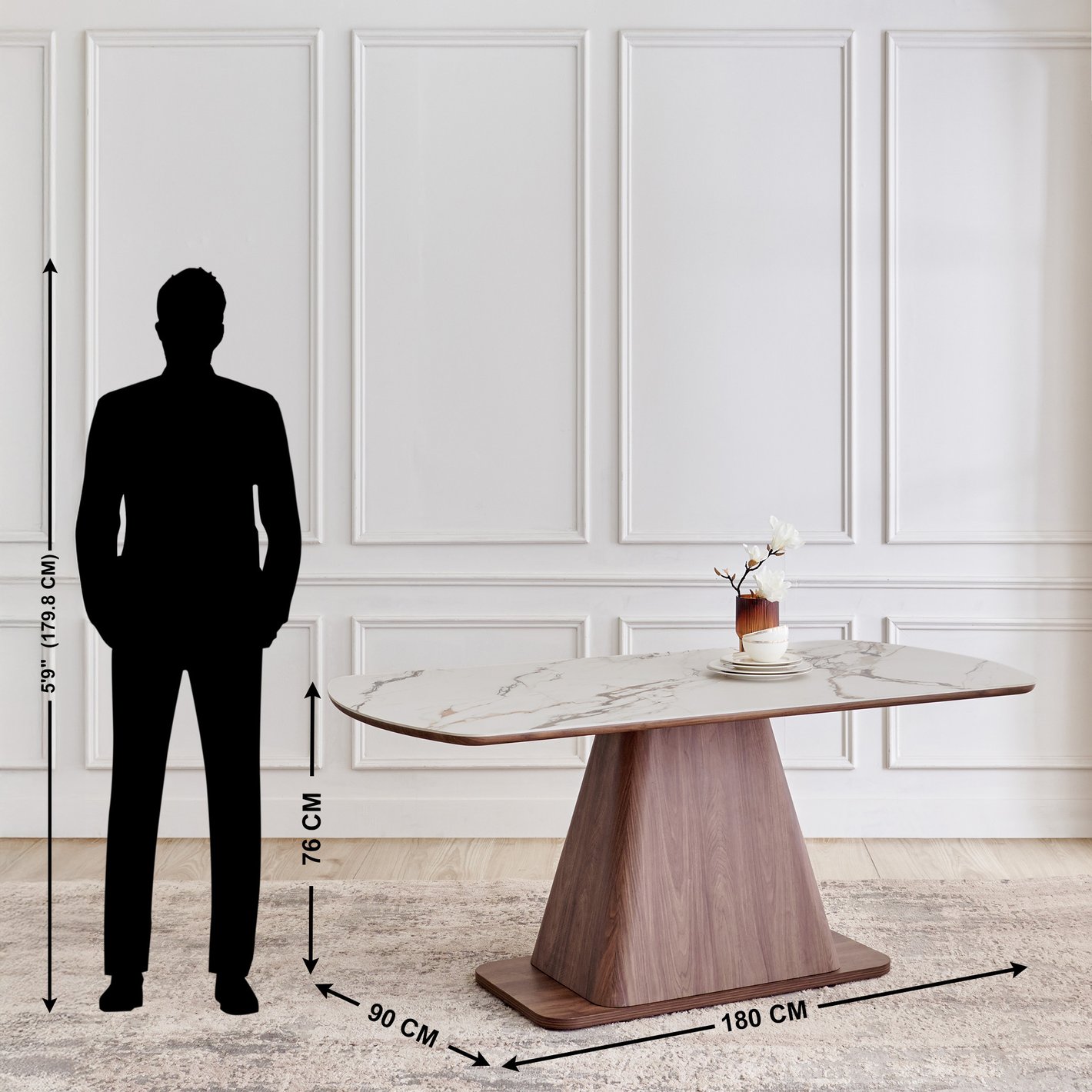 | Height | 76cm | A standard dining table height. |
