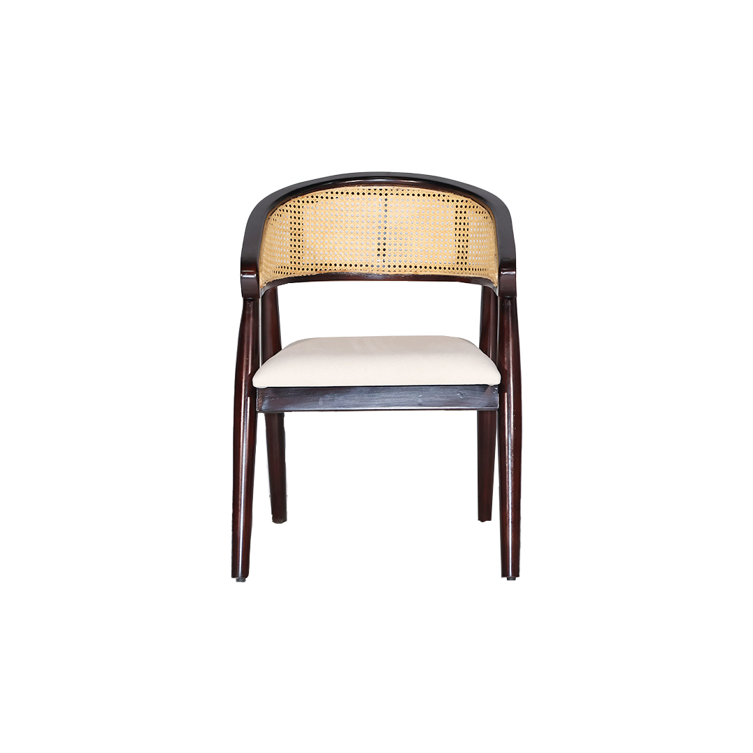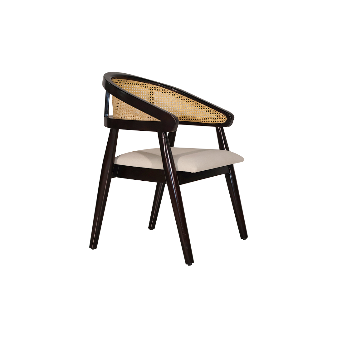 Backrest: The backrest is a curved, barrel-style frame that wraps around to form the armrests. The inner panel features traditional cane or rattan webbing in a natural, light honey tone, offering textural contrast and breathability.